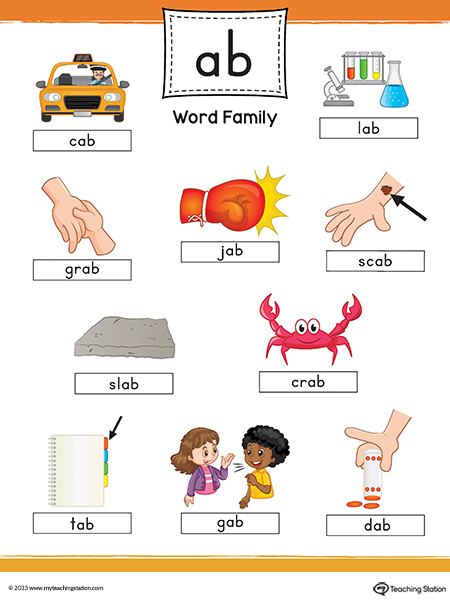 Help your students practice reading words ending in -AB and identifying the matching image with this printable worksheet.