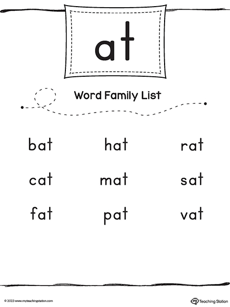 Use the AT Word Family List to practice reading rhyming words that end in -AT. The list includes simple CVC words to help young children practice blending letter sounds.