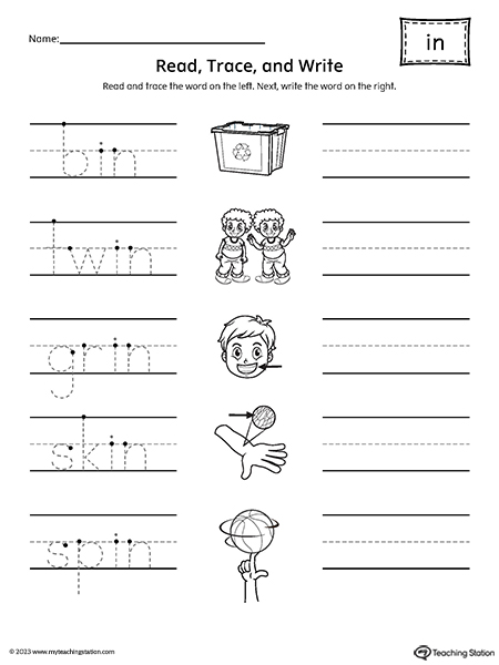 Use the IN Word Family worksheet to help children learn to read by blending letter sounds and forming words that match the pictures. Students practice developing reading and spelling skills by focusing on word patterns and common ending sounds. This printable activity includes: reading CVC words, matching word-to-picture, connecting letters to build a CVC word, spelling, and writing a word ending in -IN.