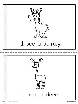 Practice beginning sounds with the Letter D Words Printable Mini Book in Color. Each page includes a word that begins with the letter D and a colorful picture that represents the word. List of words: door, dog, dolphin, donkey, deer, duck, dragonfly, dinosaur, and dress.