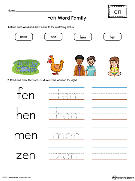 With this free -en words printable activity, children practice spelling CVC words by writing the missing letter to complete the word of the matching picture.